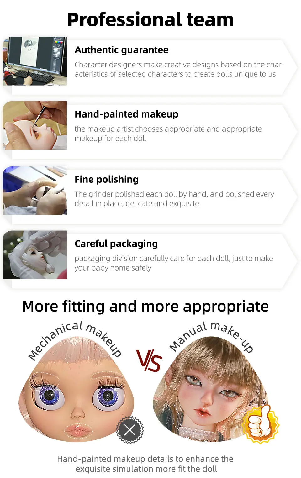 1.Equipo de fuerza: centrándose en muñecas BJD desde hace más de 10 años, integrando I+D, diseño, producción y ventas;Posee el pintor, modelador, tocador y maquillador senior original, desde la creación, diseño hasta el moldeado, moldeado, esmerilado, maquillaje y luego hasta el diseño y producción de ropa de hasta cientos de procedimientos de trabajo, como costura y modelado. Todo completado por artesanos experimentados, presentado a su muñeca BJD, cada estilo es un valor de arte único y altamente estético.